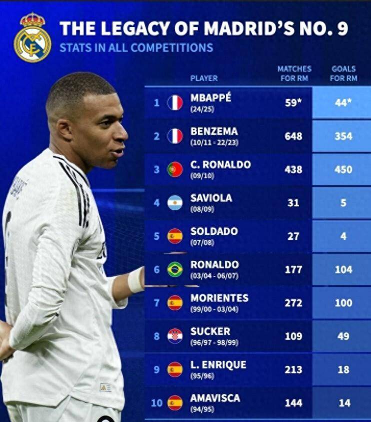 德转回顾皇马9号球星:大罗、C罗、本泽马、姆巴佩上榜